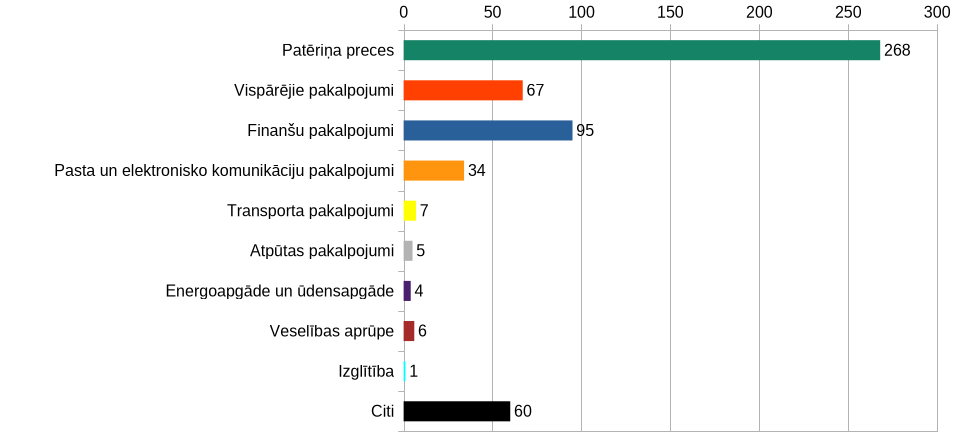 Visvairāk sūdzību un jautājumu PIAA saņēma par patēriņa precēm (268 jeb 48,99%), finanšu pakalpojumiem (95 jeb 17,37%), vispārējiem pakalpojumiem (67 jeb 12,25%) un pasta un elektronisko komunikāciju pakalpojumiem (34 jeb 6,22%).